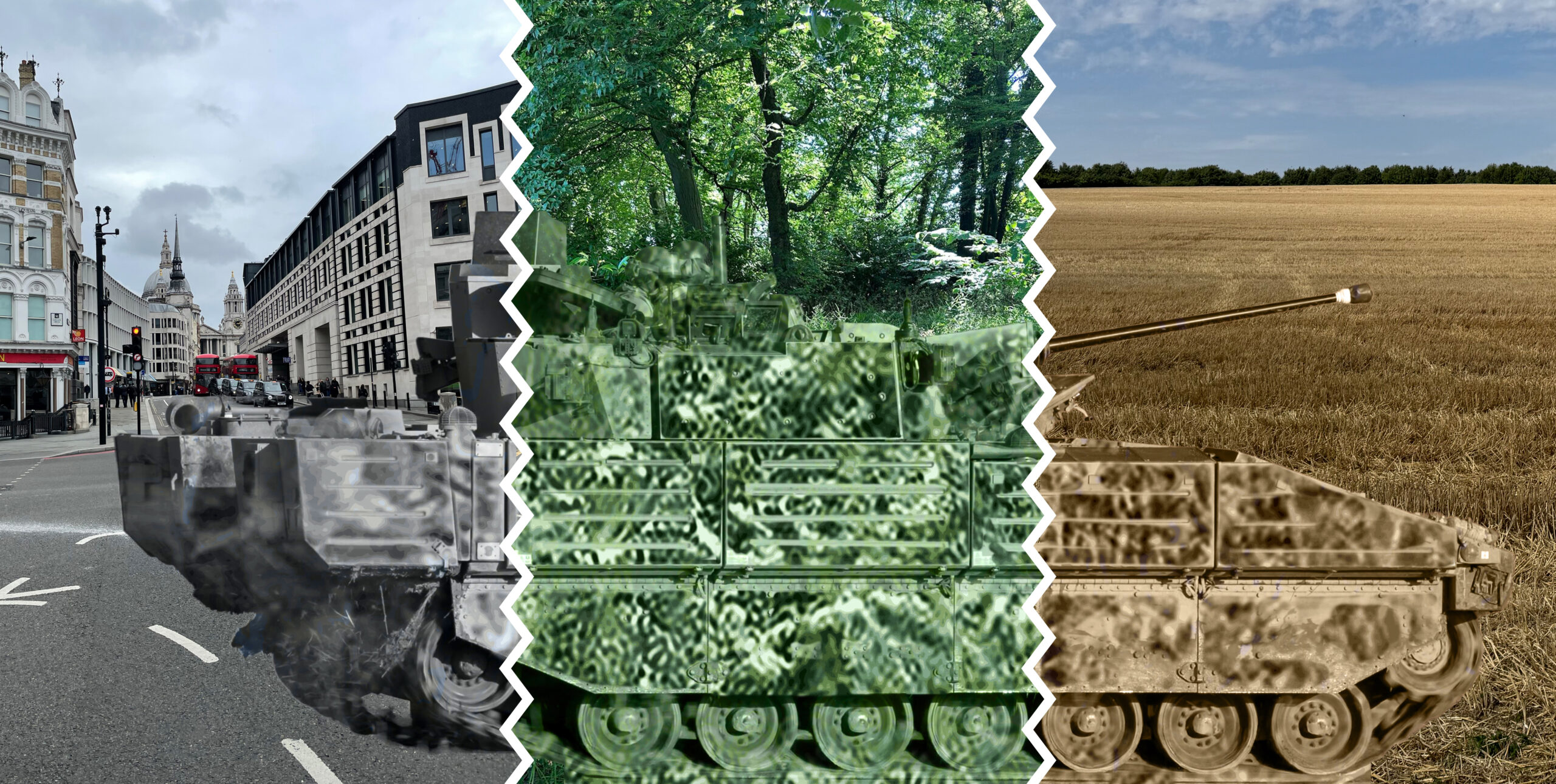 When placed on vehicle-mounted displays, MASC camouflage can automatically change surface camouflage patterns to match contrasting environments. For illustrative purposes, a British Ajax Armoured Fighting Vehicle is shown moving through urban, woodland, and cornfield settings. As it progresses, its surface camouflage changes to match each background at the exact moment it is encountered.