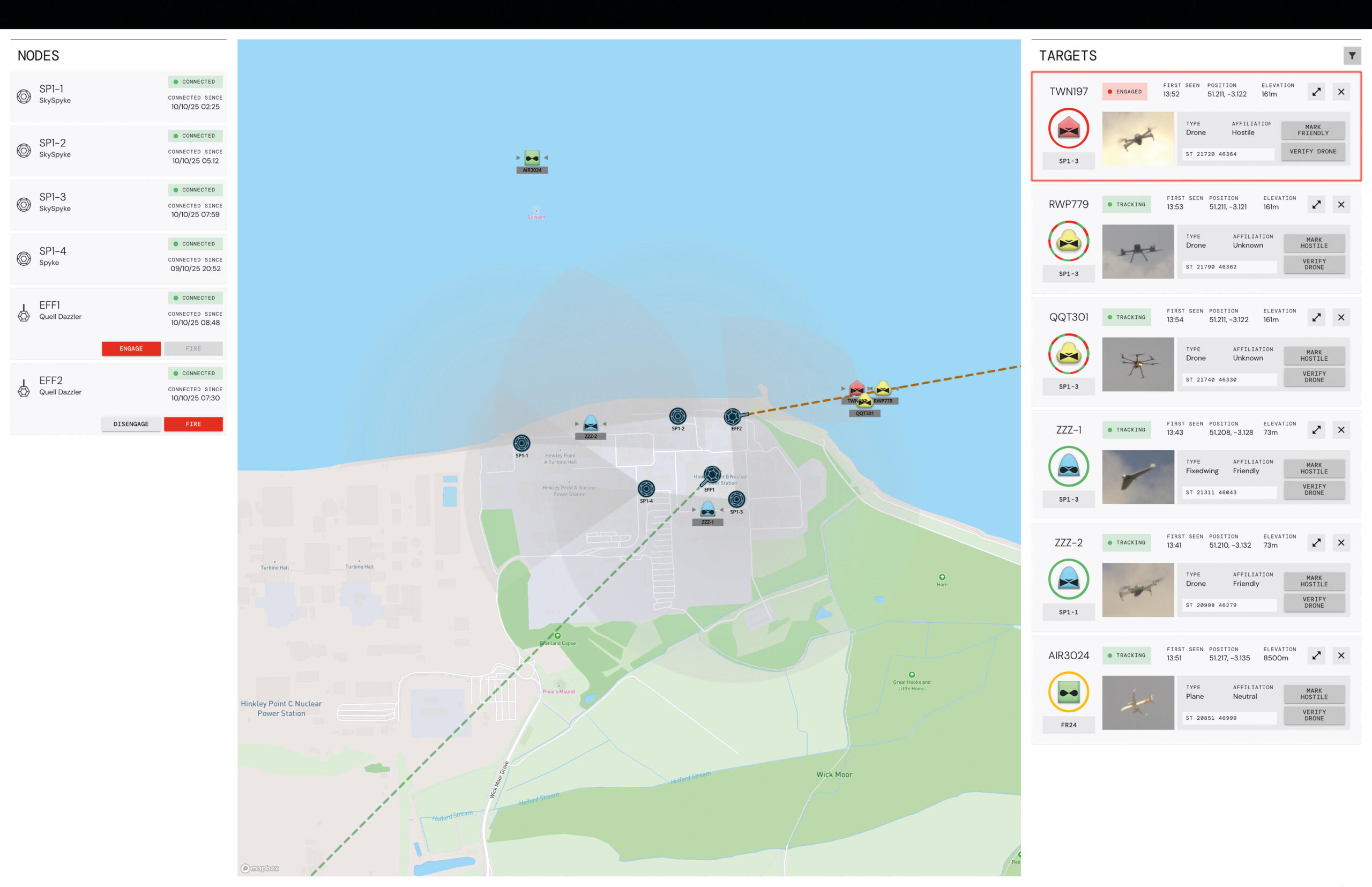 Quell’s Fairfax C2 provides real-time situational awareness and simultaneous operator control across all deployed Quell SkySpyke®, Spyke®, and effector units. The data is synthesised in real time within Quell’s Fairfax C2 platform, giving operators a unified situational view and the ability to control their response either actively or automatically.